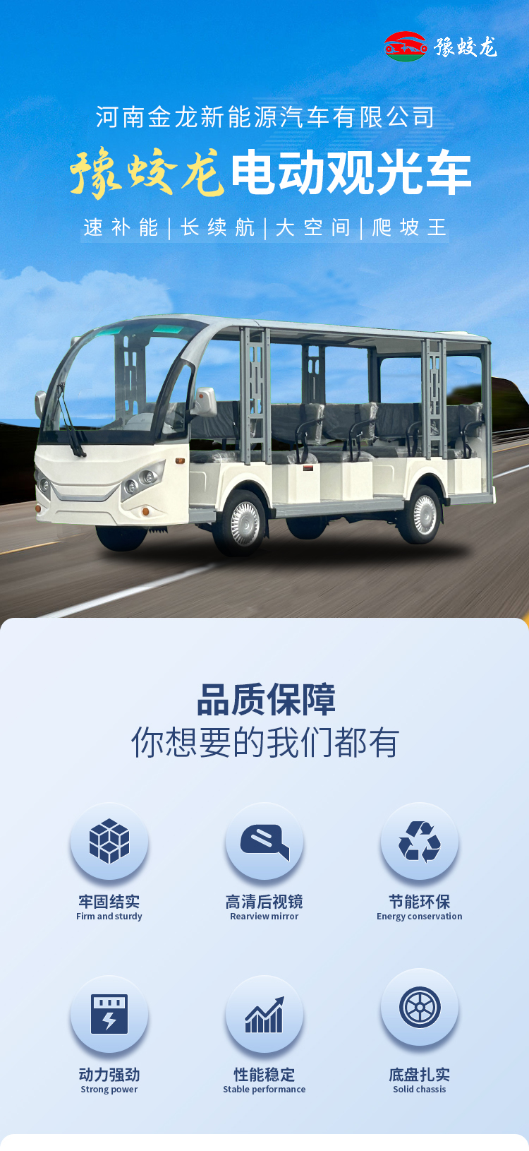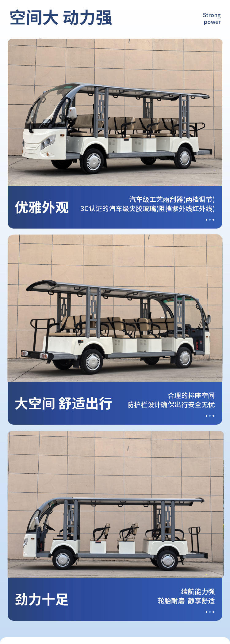 JLGD系列電動觀光車不僅有簡潔、大方、飽滿、美觀的外形設計,還搭配米黃色的內飾布置,外加皮革座椅及扶手,使得該車成為景區的亮點和宣傳名片。