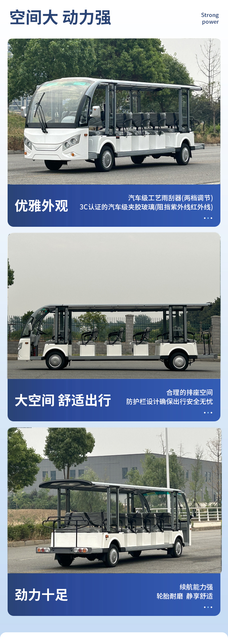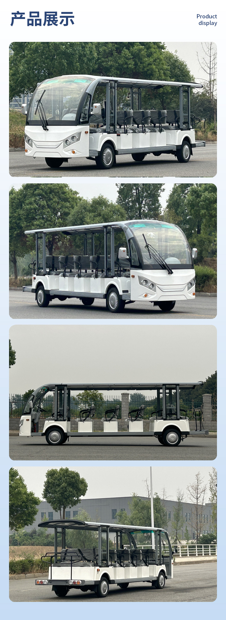 JLGD型系列電動觀光車不僅有簡潔、大方、飽滿、美觀的外形設(shè)計,還搭配人體學(xué)設(shè)計的豪華PU面料座椅,防滑鋁合金地板,鈑金、GFRP玻璃纖維及鋁型材輕量化設(shè)計的車身,美觀耐用,使得該車成為景區(qū)的亮點和宣傳名片。