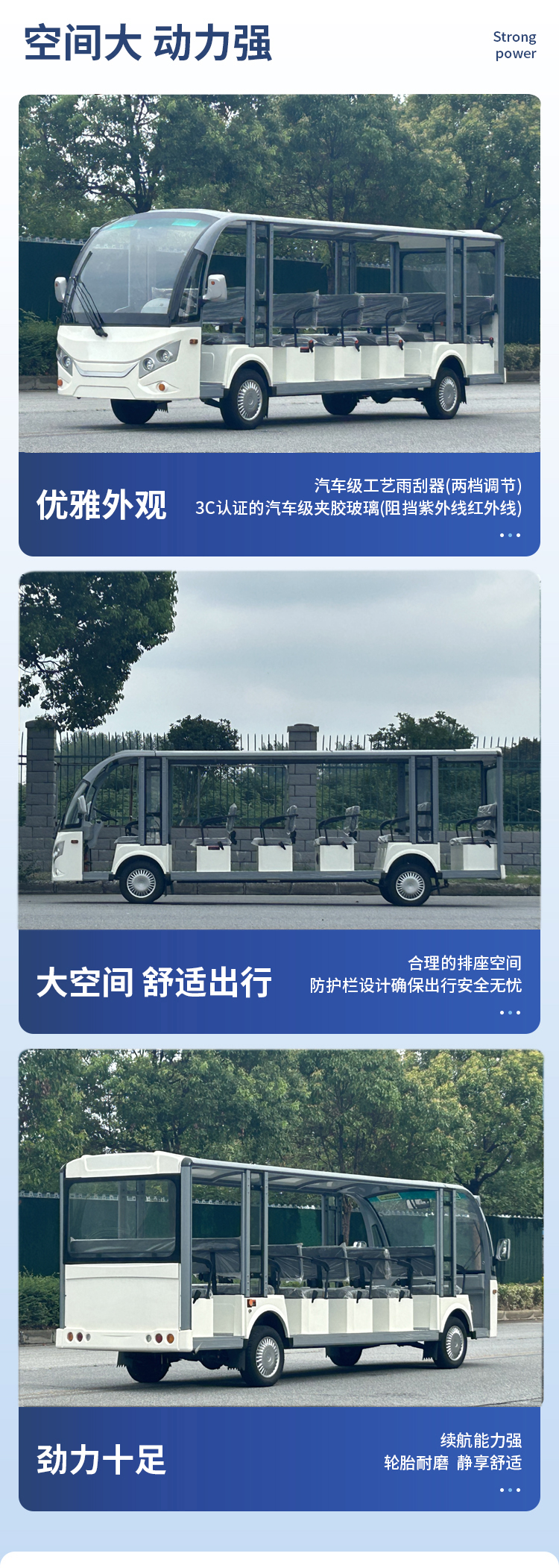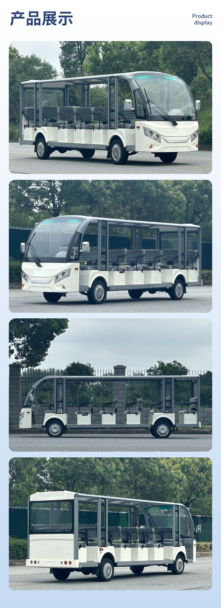 JLGD型系列電動觀光車不僅有簡潔、大方、飽滿、美觀的外形設計,還搭配人體學設計的豪華PU面料座椅,防滑鋁合金地板,鈑金、GFRP玻璃纖維及鋁型材輕量化設計的車身,美觀耐用,使得該車成為景區的亮點和宣傳名片。
