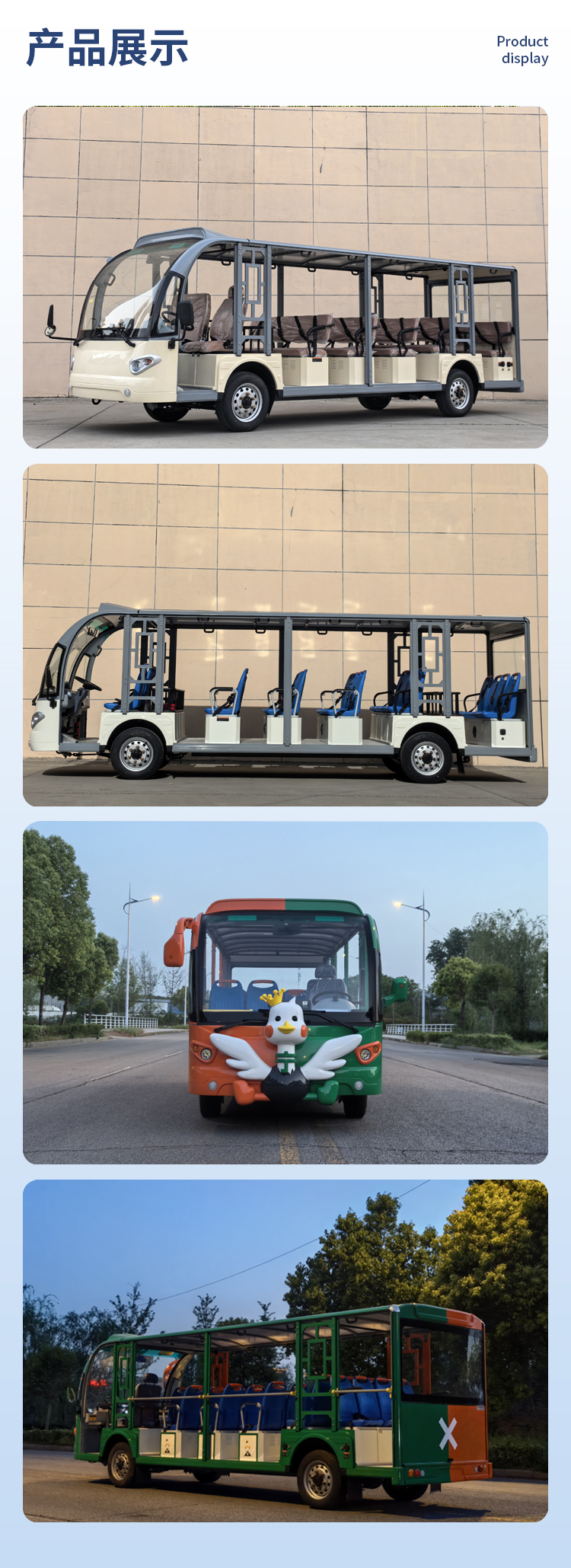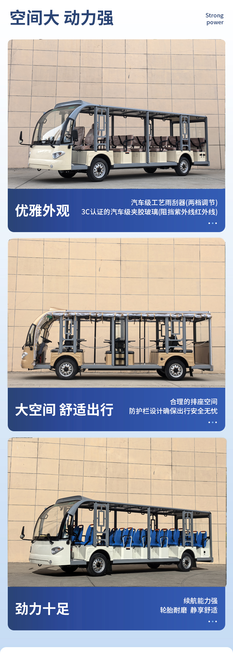 JLGD型系列電動觀光車不僅有簡潔、大方、飽滿、美觀的外形設計,還搭配人體學設計的豪華PU面料座椅,防滑鋁合金地板,鈑金、GFRP玻璃纖維及鋁型材輕量化設計的車身,美觀耐用,使得該車成為景區的亮點和宣傳名片。